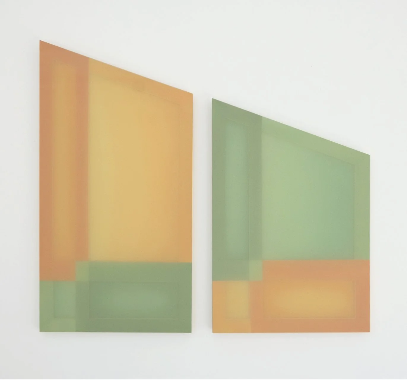 Taking cue from the reflections which cascade across walls and floors, Gilroy harnesses light play to create chromatic and spatial harmonies evocative of our environment. These artworks respond intimately to the sites they inhabit, absorbing the language of their surroundings. Light doesn’t just illuminate; it engages - its daily dance with the hues bring the works to life, casting new moods as time shifts. The works in To a Shadow’s Edge are inspired by the fleeting geometries of light and shadow within the architecture of the gallery, and the quiet impression these shadows leave behind. In these quiet transitions, the reading of colour and form is never fixed, but always evolving.